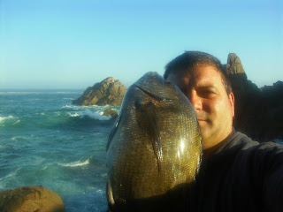 Viva pessoal, num destes dias foi pôr a minhoca de molho , nesse dia o mar estava mexido como gosto, já tinha tirado uns sargotes para a grelha quando ferro este bonito dentuças, começa a luta, o velhaco queria mesmo era brincar as escondidas tanto vinha a tona de agua como desaparecia nela ,com muita calma fui levando o velhaco para onde lhe podia deitar a mão , pois neste pesqueiro tenho tirado bons peixes mas perdidos uns tantos , há bem pouco tempo perdi ali um robalo de tamanho bem considerável que ainda ando aziado , mas como na pesca só conta os que trazemos para casa este veio mais eu:))))...